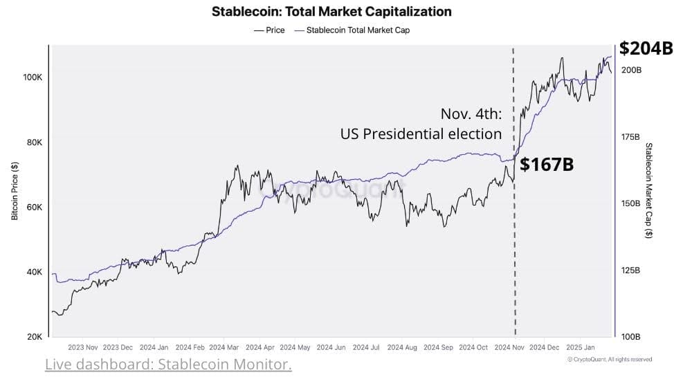 Incluso con la caída, la capitalización total del mercado de stablecoins ha crecido a 204 mil millones desde la victoria de Trump, un aumento de 37 mil millones. Este crecimiento muestra que el dinero sigue entrando al espacio cripto.