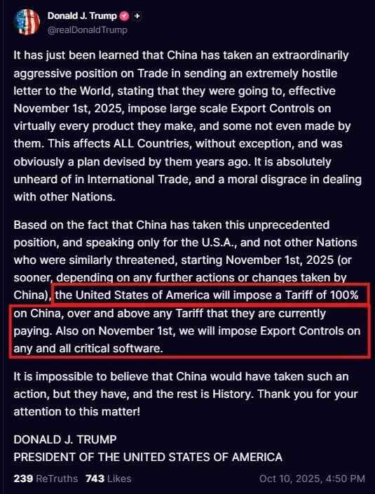 By late evening, the situation escalated dramatically. US President Trump announced a 100% tariff on China starting November 1st, along with export controls on “any and all critical software.”